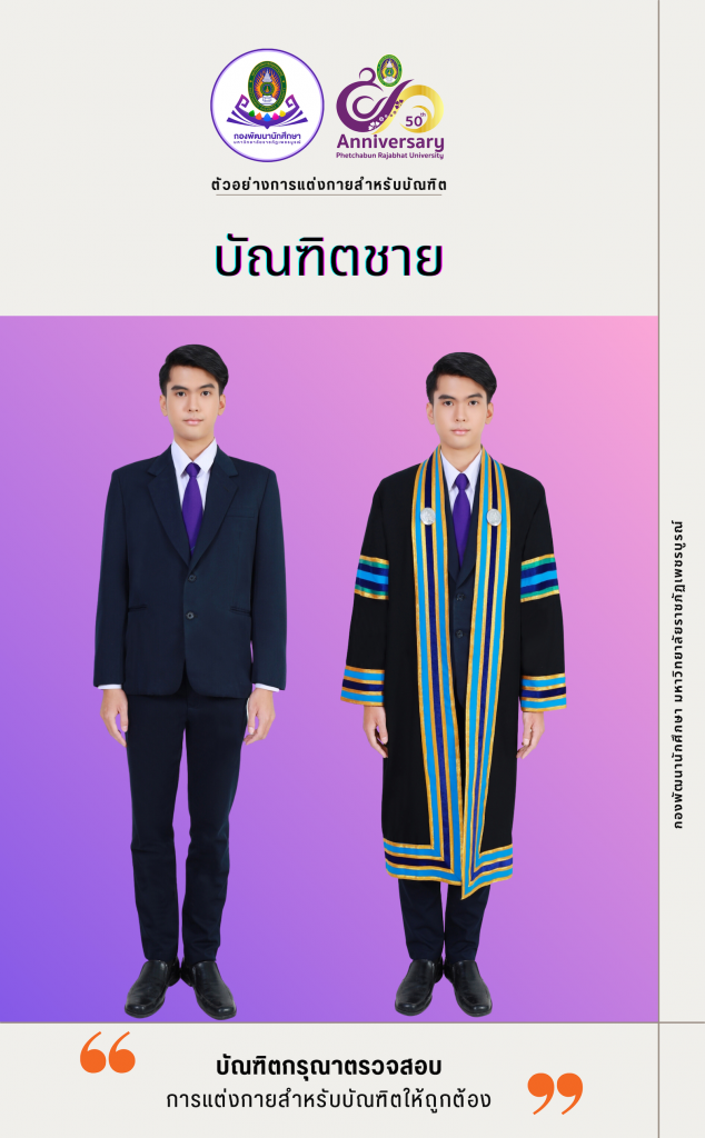 – สวมเสื้อเชิ้ตแขนยาวสีขาวไม่มีลวดลาย(เสื้อเชิ้ตต้องติดกระดุมคอได้) สวมกางเกงขายาวและเสื้อสูทสีกรมท่าเท่านั้นและเป็นสีเดียวกัน ผูกเนคไทสีกรมท่าของมหาวิทยาลัย สวมถุงเท้าสีดำไม่มีลวดลาย สวมรองเท้าหนังหุ้มส้นสีดำล้วนไม่มีลวดลาย และไม่มีเครื่องตกแต่งโลหะ ตัดผมทรงสุภาพ ไม่ไว้หนวดเครา สวมครุยวิทยฐานะตามสาขาวิชา ความยาวประมาณครึ่งน่อง ติดบัตรประจำตัวบัณฑิตไว้ที่หน้าอกด้านขวา